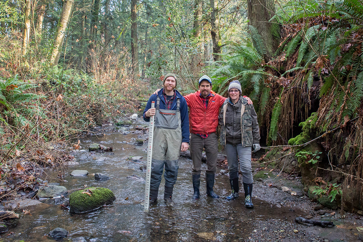 Featured Image: Staff from Wild Fish Conservancy, Bainbridge Island Land Trust, and City of Bainbridge Island standing in Springbrook Creek.