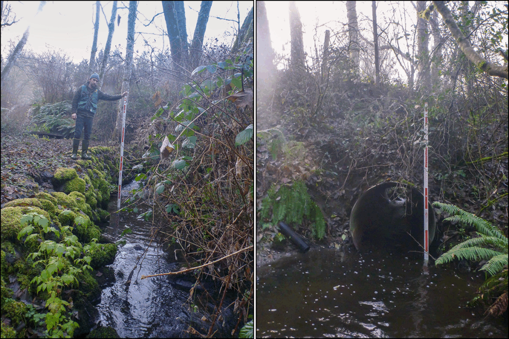 Figure 1: Barnabee Farms bank armoring (left) and culvert (right) that will be removed and replaced as part of the Barnabee Farms fish passage project, one of the 20 restoration projects identified during the 2016–2018 assessment.