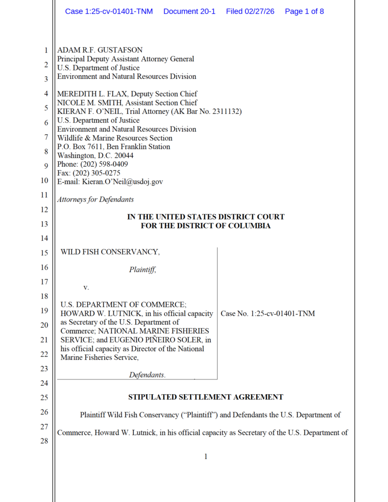 This document is a Stipulated Settlement Agreement filed on February 27, 2026, in the U.S. District Court for the District of Columbia between the Wild Fish Conservancy (Plaintiff) and the U.S. Department of Commerce, National Marine Fisheries Service, and associated officials (Defendants). The agreement resolves a lawsuit (Case No. 1:25-cv-01401-TNM) alleging the defendants failed to issue a required 12-month finding regarding a January 2024 petition to list Gulf of Alaska Chinook salmon under the Endangered Species Act. Under the terms of the settlement, the National Marine Fisheries Service commits to submitting the 12-month finding to the Federal Register for publication on or before May 13, 2026. |