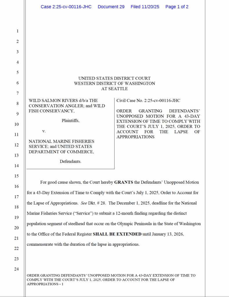 For good cause shown, the Court hereby GRANTS the Defendants’ Unopposed Motion for a 43-Day Extension of Time to Comply with the Court’s July 1, 2025, Order to Account for the Lapse of Appropriations. See Dkt. # 28. The December 1, 2025, deadline for the National Marine Fisheries Service (“Service”) to submit a 12-month finding regarding the distinct population segment of steelhead that occur on the Olympic Peninsula in the State of Washington to the Office of the Federal Register SHALL BE EXTENDED until January 13, 2026, commensurate with the duration of the lapse in appropriations. |